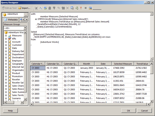 Take a look at the results returned in the Query Designer. The first row shows that the Internet Sales Amount for the 31st of January, 2003 was about $17,468.54. The TrendValue is the Internet Sales Amount for the 31st of January, 2002; which was about $21,762.16.