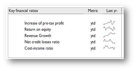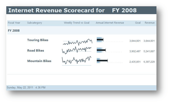 The sparkline report in the following figure, which might be only a small region of a larger executive dashboard, provides useful trend information at a glance. A click-through feature in this report could enable the user to view more detail and expand on the context of the trend to gain more insight.