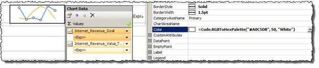 Here’s a simple example of the function applied to several report element background and foreground color properties. I’ve used the SolidQ corporate standard colors #A0C5DB and #CBDFEC to create various shades. The example below shows the Color property of a line chart series color set using the RGBToHexPalette function. In this case the chart line will be a shade half way between the base color and white.