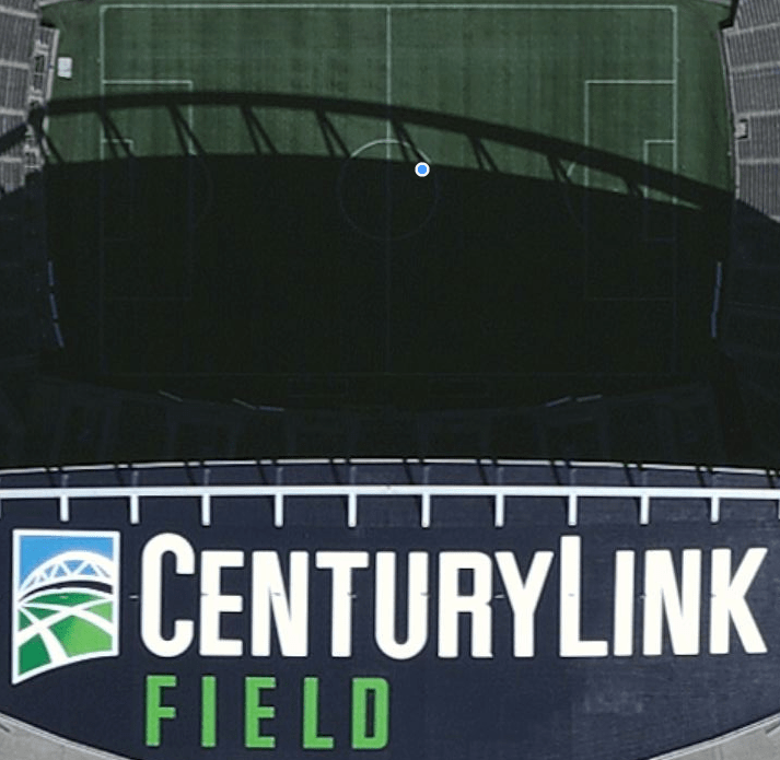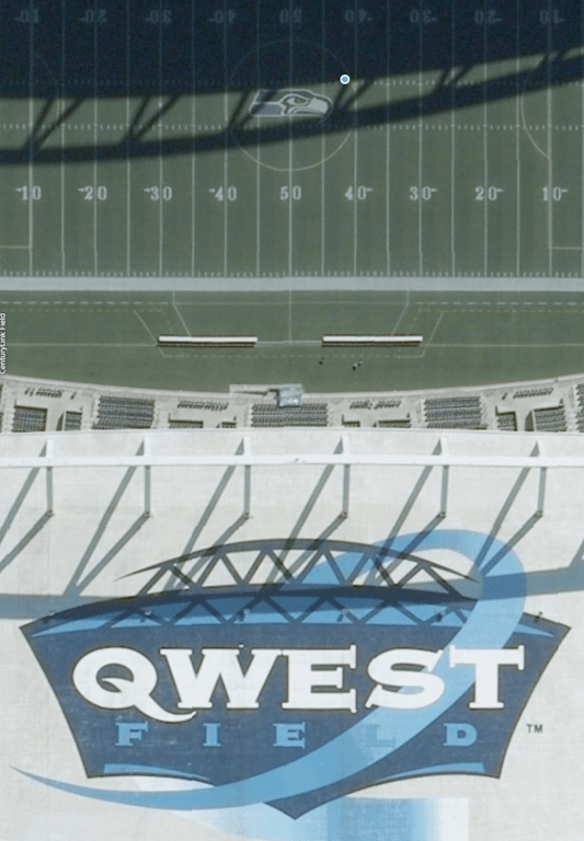 Open Bing Maps to an aerial view (not the birds eye view), locate the football stadium south of downtown Seattle and zoom in. You will see the newly rebranded CenturyLink Field as a soccer/football field. Keep zooming in and it will magically transform into Qwest Field/Seahawks Stadium and an American football field.