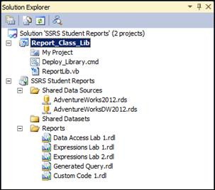 You are encouraged to write this code yourself using the code completion and debugging tools in Visual Studio. If you need some help or would like to speed up this lab, you can open the SSRS Completed Labs solution and copy the code from the completed version of the Report_Class_Lib project.