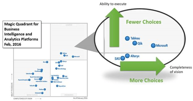 Microsoft is rated by Gartner as the having the most complete vision while Tableau and Qlik rate slightly higher in their ability to implement. This makes perfect sense to me as “Microsoft BI” is not one simple product choice. This is my opinion: The Microsoft BI platform has many components and offers many choices, but is certainly comprehensive and scalable. Microsoft have always erred on the side of offering choices where some competitors have a monolithic product. Power BI is great single-product solution for simple projects, and with room to grow as needed. At scale, Power BI is delivering “the last mile” of data visualization beautifully on top of the robust foundation of SQL Server, Analysis Services, Integration Services, HDInsight, Stream Analytics, machine learning and all the other Azure services.