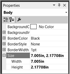 Click the Body (the area within the designer report boundaries) to check the Size properties, which are shown in Figure 7-3. To fit within a printable page, the body Width must be less than the report width added to the left and right margins.