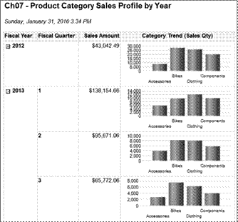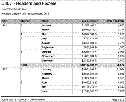 Figure 7-6 shows the second page, beginning with the page header. Of particular note is the sum- mary of data displayed on this page in “phone book” or “dictionary” style where the year and month of the first and last items on the page are summarized in the header. Also note that even though the group for 2012 is split between pages one and two, the table header is displayed at the top of the page and the year is repeated for quarter 3. In the table, after all four quarters, a group footer shows a total of the year and then a grand total is displayed at the end of the table for all three years.