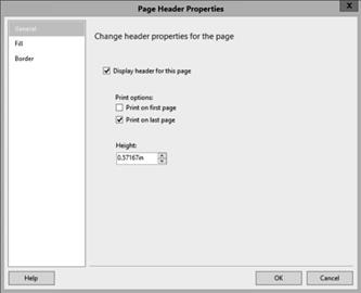 A common purpose of the page header is to display an abbreviated form of information in the report header. Naturally, you don’t want to show redundant information on the first page so it makes sense to hide the page header. Right-click the report body to add a page header and then right-click the page header to show the Page Header Properties dialog, used to set a number of related properties.
