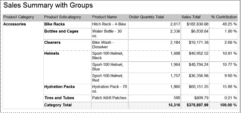 Figure 7-35 shows a report with a document map. The report name is the top-level item in the document map, followed by the product category and subcategory names.
