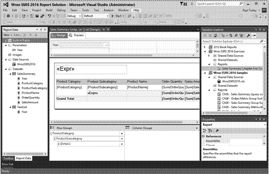 3. Open the file named Wrox SSRS 2016 Report Solution.sln. SSDT opens with the solution and related projects listed in the Object Explorer on the right side of the report design interface. Figure 6-3 shows SSDT open with a report open in the Design window.