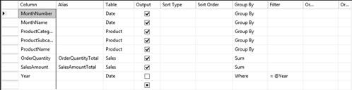 Despite the desire to filter data by the Year, that column doesn’t need to be returned in the query results. You can see that the Year column has been included from the Date table and the Output checkbox has been unchecked. To add a parameter, type the parameter name you want to use in the Filter cell preceded by an equal sign (=) and an ampersand (@). In the graphical query designer, a column that is used only for filtering is excluded from the GROUP BY list by changing the selection to “Where.” In this case, the designer references the Year column in a HAVING clause to implement filtering.