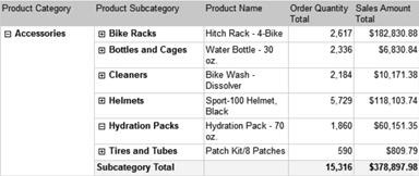 In a table, adding a total to a row group adds a new row that applies an aggregate function (for example, SUM) to all the members of that group. The same applies to a total added to a matrix col- umn group. By adding a total row or column, you’re actually adding a total that applies to the par– ent of the group. Consider this example. Suppose columns are grouped by quarter and then by year. If you were to add a total to the Quarter column group, the total would be for all the quarters add- ing into the year. This means that a total applied to the topmost group will always return the grand total for all records in the data region. This is evident in the example shown in Figure 6-10 where the table data region is grouped and totaled by Subcategory.