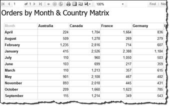 If you were to preview the report at this point in the design process, it would look like Figure 6-12. Out of the box, the rows and column groups are naturally sorted alphabetically.
