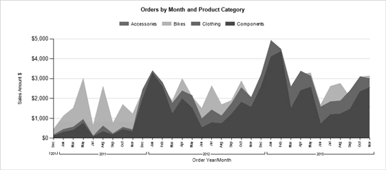 Some of the more common chart types (such as column, bar, line, and area) can be used for different views of the same data. Pie charts present a more simplified view and work well with fewer category values. Other charts are more specialized and may be appropriate for multi-value data points, range values, and variances. All the chart types support dynamic capabilities, such as actions and tooltips. Using these features in report design, a chart user can get more information and details by hovering over or clicking a range, point, or area of the chart. Let’s take a brief look all the major chart types.