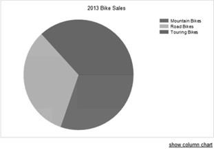 Here’s a quick experiment. Open the report named C08 – Pie and Column Chart in the Wrox SSRS 2016 Samples project. Preview the report and try to quickly determine the sales ranking of the three Bike product categories in 2013. Figure 8-4 shows the data visualized in a pie chart. That’s a tough one, huh?