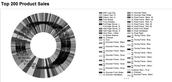 Like the previous sample, I added a textbox with a drill-through action, but this one controls the chart series labels on the pie chart. Having data labels enabled does help you see the value that each slice represents, but, again, this is only useful with a limited number of axis values. Now that you see how this works, preview the report once more. Now, select 200 for the Top Products parameter list and press Enter. Click the “Show data labels” link below the pie chart and, as shown in Figure 8-6, it should be obvious that the bar chart is a better choice.