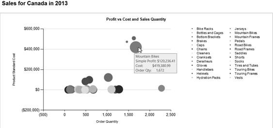 For sales orders grouped by subcategory, for a selected year and country, the product cost is plot- ted on the vertical axis and order quantity on the horizontal axis. Bubble size represents the simple profit calculated in the query. The example shown in Figure 8-7 helps you discover a valuable insight by revealing that Mountain Bike sales were particularly profitable in Canada.
