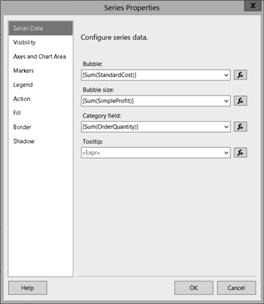 The bubble chart properties are most easily set in the Series Properties dialog shown in Figure 8-8. With the sample report open in Design view, click the chart to show the Chart Data window and then use the call-out menu for the series in the Values field list. Here, the StandardCost, SimpleProfit, and OrderQuantity fields are assigned to the Bubble, “Bubble size,” and Category fields, respectively.
