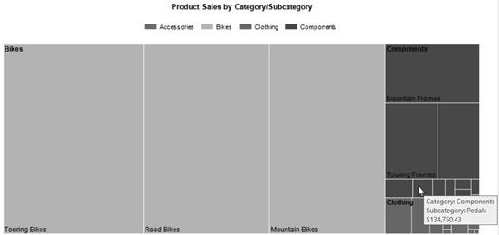 Two new chart types introduced in SQL Server 2016 Reporting Services are the Tree Map and Sunburst charts. Sample reports are provided for both, which you can see in Figures 8-9 and 8-10.