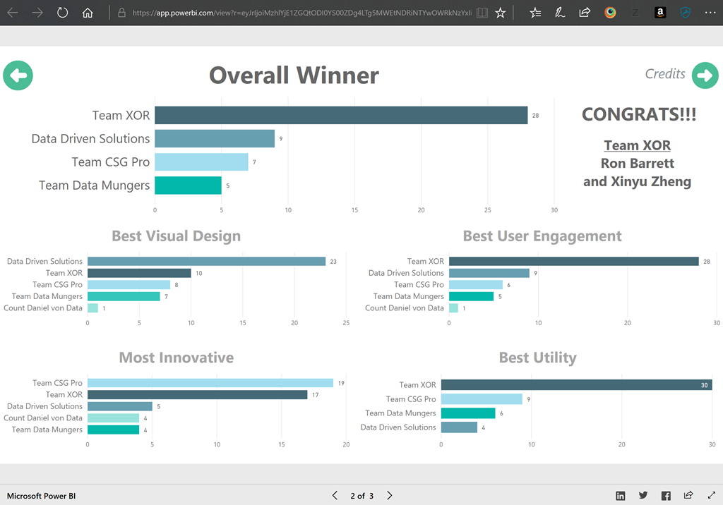 The results of last month’s Power BI Global Hackathon are in! The Hackathon was facilitated by our our PUG here in Portland with the goal of welcoming global contenders in subsequent contest. Five teams entered the contest using publically-available data to visualize and tell data stories using our favorite data analysis platform. Congratulations to Xinyu Zheng and Ron Barrett for winning the challenge with their entry, analyzing Yelp restaurant star ratings. These were all great entries and you can view the contest results in the Power BI report below.