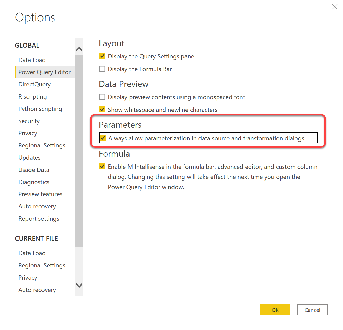 Start by enabling the feature “Always allow parametrization in data source and transformation dialogs” on the Power Query Editor page in the Option dialog.