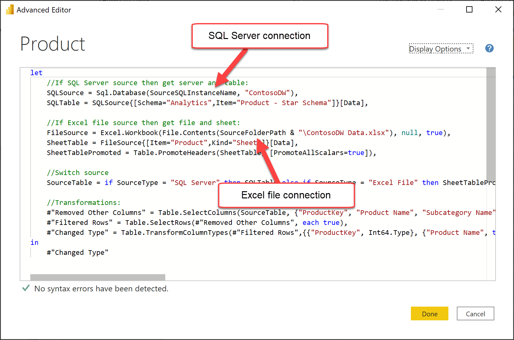 Here are two examples of parameterized connections. For the SQL Server connection, the server/instance name is passed as the first argument to the Sql.Database function. The second example concatenates the folder path (stored in the SourceFolderPath parameter) with the file name to create the fill folder and file path.