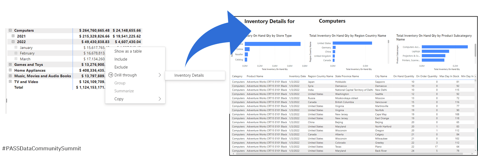 A significant advantage is that we are able to use the right reporting tool to server two different purposes. Power BI is great for analytical reporting based on a semantic data model, and Paginated reports is a great tool for detail reporting directly from a transactional database. There is no need to clutter and complicate the data model when I can just use the best tool for the job, and then provide navigation features to make them work together.