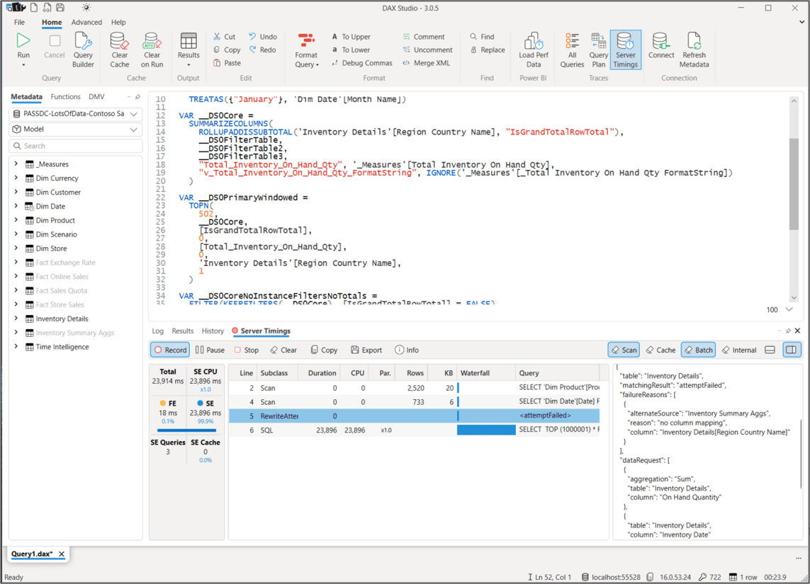 The first time I tried to use the aggregations in the chart that grouped by the Region Country Name field, performance didn’t improve, so I knew that something was wrong. To troubleshoot, I captured the generated DAX query using Performance Analyzer, pasted it into DAX Studio and ran a trace using Server Timings. The Server Timings trace revealed that the attempt to use aggregations failed because I had accidentally used the Region Country Name field from the Inventory Details table rather than the Store dimension table referenced in the aggregation design. This was my goof, but it was easy to find and correct using the trace.