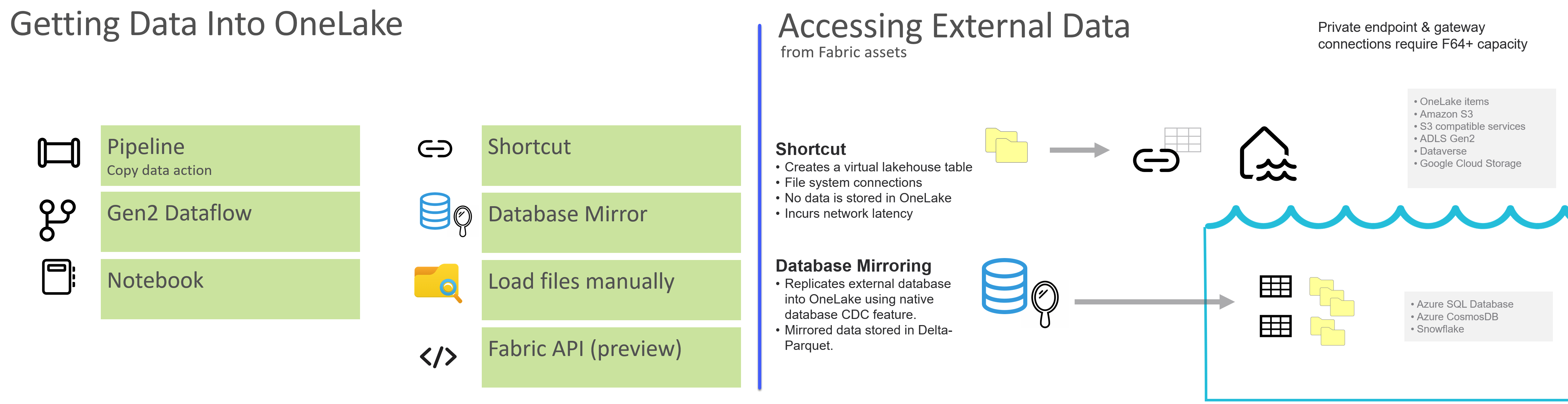 You can create shortcuts to many types of files stored outside of Fabric OneLake which then show up as a virtual table in a Lakehouse. A prime example of the Onelake shortcut concept is in a new feature for developers who use Azure Databricks to store their data. Rather than copying data from a Databricks catalog, an Azure Databricks mirror makes the entire catalog appear as if it were in Fabric, allowing efficient Direct Lake semantic models to be created without importing any data.