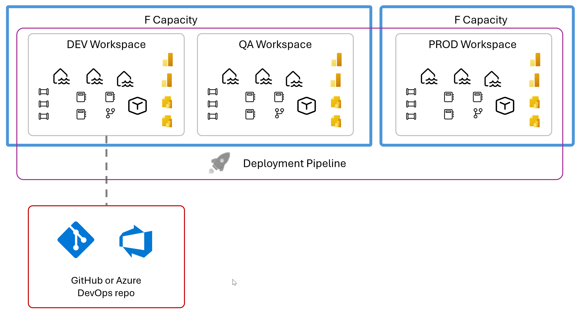 To manage separate deployment environments for release promotion from DEV to TEST or QA and Production, you should use Fabric deployment pipelines. Don’t try to shoehorn environment promotion process into your own release management tool. Embrace the product and use it the way it was designed. you can automate the deployment pipeline workspace content promotion to your build process from Azure DevOps pipelines or any other tool capable of calling REST APIs. The Fabric API documentation is here.