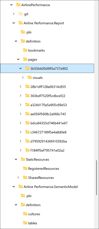 From now on, your model and report changes will be managed in the new file format, and you no longer need the PBIX file if you had saved your work in the default format previously. This shows an example of the folder structure of my project with definition files for every page in my report. You need not be concerned with the contents of all the files and folders in a project, but you now have the flexibility now to edit and manage changes using any text editor or code management tool of your liking.