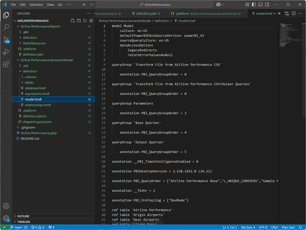 Here is my project opened in VS Code with he model definitions in TMDL format. TMDL is the new Tabular Model Definition Language which is an enhanced and simplified replacement for TMSL, the JSON-based Tabular Modeling Scripting Language.