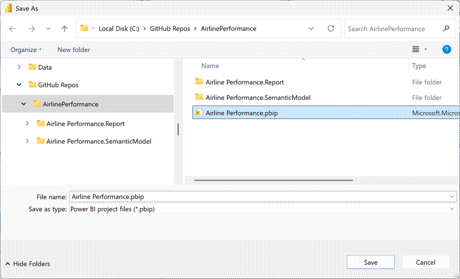 In 2023, the version control barrier was broken when the Power BI Project option was introduced. Saving your work to a project (.PBIP file) creates a folder structure and series of files for object definitions and configuration information stored in clear text. This shows the Save As Power BI project files option in Power BI Desktop. All I need to do is choose a folder and provide the project file name. The .Report and .SemanticModel folders that you see here will be created automatically.